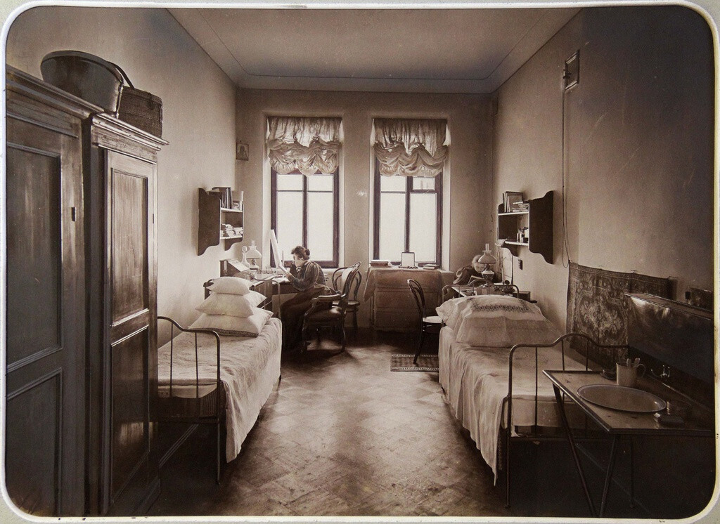 В нашей временной квартире постоянный шум и движение, несмотря на то, что нас живет всего 8 человек; живя в небольшом обществе, конечно, легче ближе познакомиться, чем в большом интернате. Все это хорошие люди; все более или менее усердно занимаются, интересуются предметами, читают… Но… почему же их общество опять-таки не может удовлетворить меня? <…> Не слыхать ни одного интересного разговора или спора; меня поражает отсутствие каких-либо высших жизненных запросов или научных интересов, когда мы сходимся вместе за чайным столом. Так себе, болтаем пустячки, а иногда даже несносный вздор; со стороны послушать — даже тошно станет <…>. Тяжелее всего то, что всегда приходится быть на виду, и как бы ни была расстроена, все-таки должна сдерживать себя, чтобы — Боже упаси! — не ответить кому-либо на навязчивые вопросы слишком односложно, или нервно или с явным нежеланием продолжать разговор.