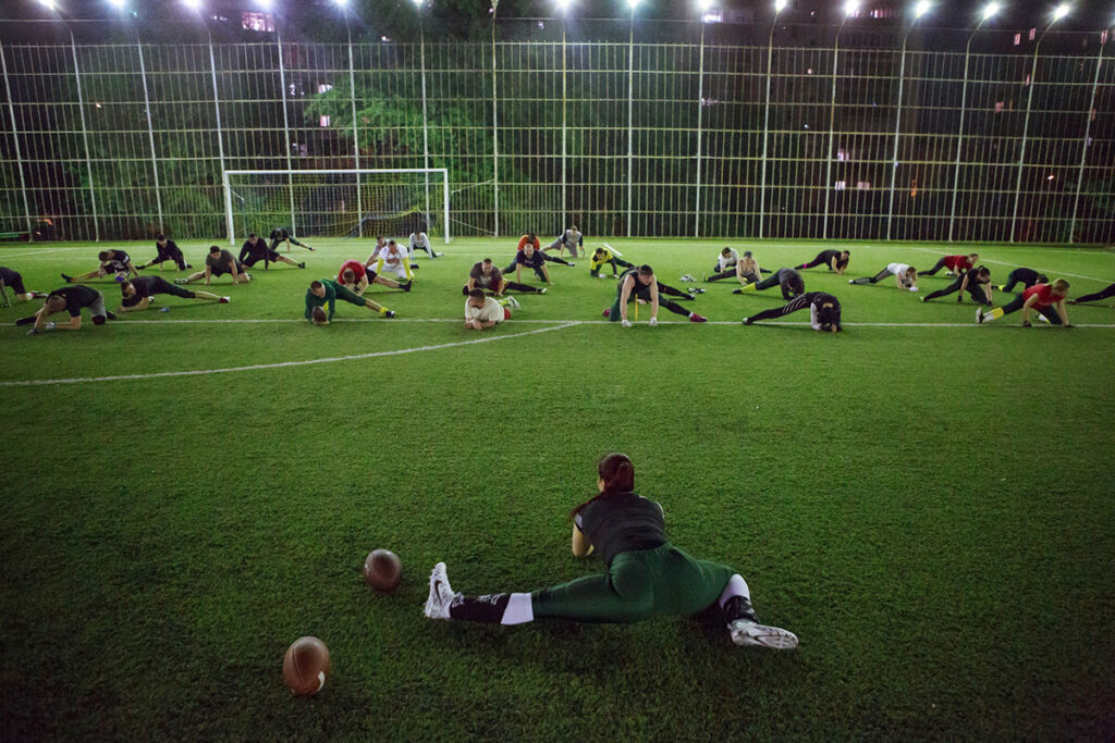Тренировка «Могучих уточек» в Воронеже.В Воронеже девушки не смогли набрать полный состав, поэтому они тренируются вместе с мужской командой «Могучие утки» и ездят играть легионерами за московские команды. Фото: Кристина Бражникова | Гласная Воронежские девушки в раздевалке перед тренировкой на сборах.Раз в год санкт-петербургская команда «Валькирии» старается организовать сборы игроков со всей страны, куда приглашают тренеров национальной женской сборной США. Фото: Кристина Бражникова | ГласнаяКоординатор защиты американской женской сборной по американскому футболу Джеф Грайбаш (в центре) тренирует девушек на сборах в Санкт-Петербурге. Фото: Кристина Бражникова | Гласная Девушка из команды Sechenov Phoenix разминается перед игрой в Москве. Фото: Кристина Бражникова | ГласнаяТаня помогает Люде затейпировать колено, чтобы снизить риск травмы во время игры. Фото: Кристина Бражникова | ГласнаяАлла помогает Лизе заплести волосы перед игрой.Команды приходят на поле минимум за два часа до начала игры, чтобы разметить поле, экипироваться и размяться. Фото: Кристина Бражникова | ГласнаяАлевтина и ее команда «Единороги» перед матчем. »Единороги» базируются на основе мужской команды «United» и делят с ними экипировку в целях экономии затрат. Если мужчины начали играть в американский футбол в России в конце 1980х, то первая женская команда появилась только в 2011 году в Санкт-Петербурге. Фото: Кристина Бражникова | ГласнаяМатч между «Стрекозами» и «Единорогами».За год девушкам удается сыграть всего 6-7 матчей. Все игры организуются за свой счет. Фото: Кристина Бражникова | Гласная Лиза отдыхает на бровке поля во время матча.Большинству команд не удается укомплектовать полный состав, поэтому опытным игрокам приходится выходить на поле на разных позициях, что физически дается тяжело. Фото: Кристина Бражникова | ГласнаяТренер «Единорогов» дует на травмированное плечо игрока, так как дежурившая на матче бригада медиков в этот раз приехала без «заморозки» (местного обезболивающего).Фото: Кристина Бражникова | Гласная «Единороги» идут на стадион после обсуждения игровой стратегии с легионерками из Воронежа в парке. Фото: Кристина Бражникова | Гласная В Воронеже тренировки обычно проходят поздно вечером, потому что в это время аренда поля дешевле. Фото: Кристина Бражникова | Гласная«Сирены» участвовали в московской женской лиге только в первый год под своим флагом, после они переквалифицировались во флаг-футбол, а отдельные участницы стали выступать на чемпионате легионерами в других командах. Фото: Кристина Бражникова | Гласная Настя перед игрой против ее бывшей команды «Единороги». Фото: Кристина Бражникова | ГласнаяЗахват игрока с мячом. Фото: Кристина Бражникова | Гласная«Единороги» атакуют «Стрекоз». Фото: Кристина Бражникова | Гласная«Единороги» обсуждают с тренером тактику игры во время перерыва. Фото: Кристина Бражникова | ГласнаяДаша начала играть в американский футбол в Воронеже, но теперь переехала в Москву по работе и перешла из «Могучих уток» в «Единороги». Фото: Кристина Бражникова | Гласная Тренер помогает уйти с поля травмированному игроку. Фото: Кристина Бражникова | Гласная «Единороги» после выигранного у «Стрекоз» матча. В сезоне 2020 они заняли второе место в московской лиге. Фото: Кристина Бражникова | Гласная