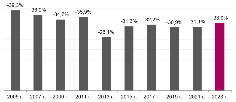 Результаты исследования, проведенного на основе данных Росстата, приводит аналитическая служба аудиторско-консалтинговой сети FinExpertiza. Согласно выводам аналитиков, гендерный разрыв в трудовых доходах, отмеченный в 2023 году, стал максимальным за 11 лет. Средние заработки российских женщин, занятых на крупных и средних предприятиях, в 2023 году были на 33%, или почти на 28 тыс. рублей меньше, чем у мужчин, и составляли 56,2 тыс. руб. после вычета подоходного налога с учетом всех премиальных.