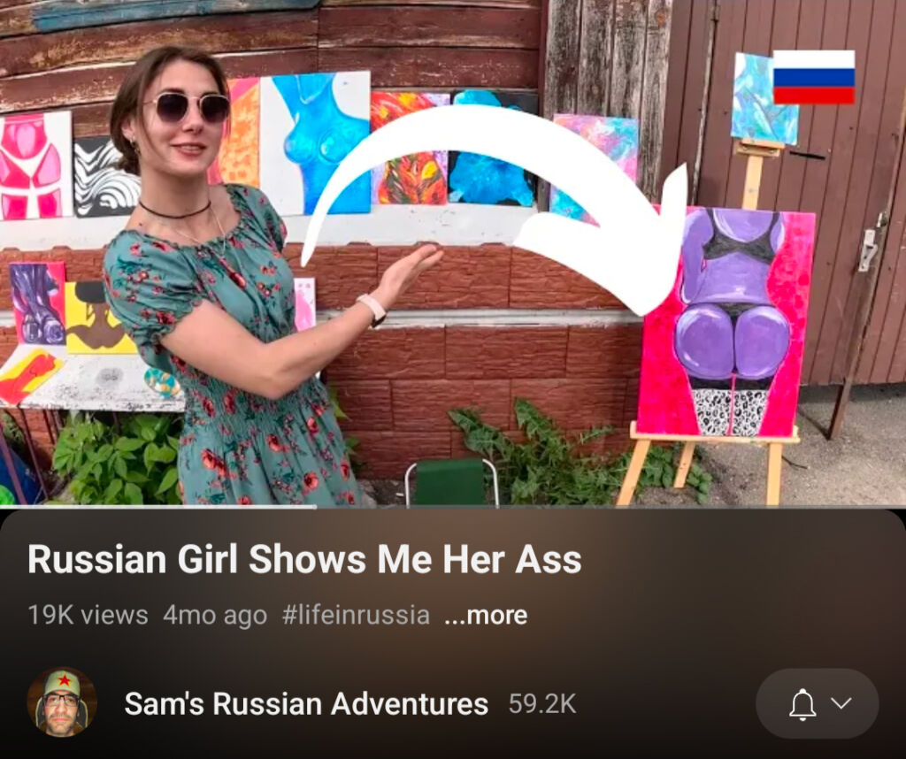 Сэм нашел простой способ привлечь аудиторию. «Русская девушка показывает мне свою жопу», «Англичанин приглашен на вечеринку только для девушек в России», «Она сказала, что ЭТО запрещено в России» — примеры заголовков к видео, в которых Самюэль делает самые обычные вещи. Посещает ярмарку в историческом центре Владимира, где находит красивый арт с женской фигурой, — это видео с первым заголовком. Идет на женский фестиваль йоги — для него выбран второй заголовок. Или гуляет с камерой по частному сектору, где местная жительница криком запрещает ему снимать, — это уже третий.
