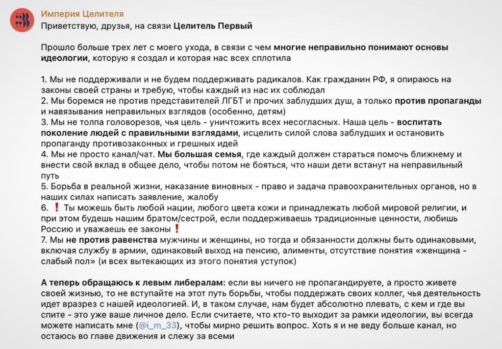 Целитель Первый (Максим С.) при этом настаивает, что его последователи — не «армия головорезов», а «сообщество, которое помогает встать на “правильный путь”». После разговора с «Гласной» он разместил в телеграм-канале поясняющий пост о целях и идеологии «Империи», которую их основатель называет «большой семьей». Несмотря на напоминания лидера движения о том, что его участникам не стоит открыто призывать к убийствам или физическому насилию, подобная риторика в чате не затухает.