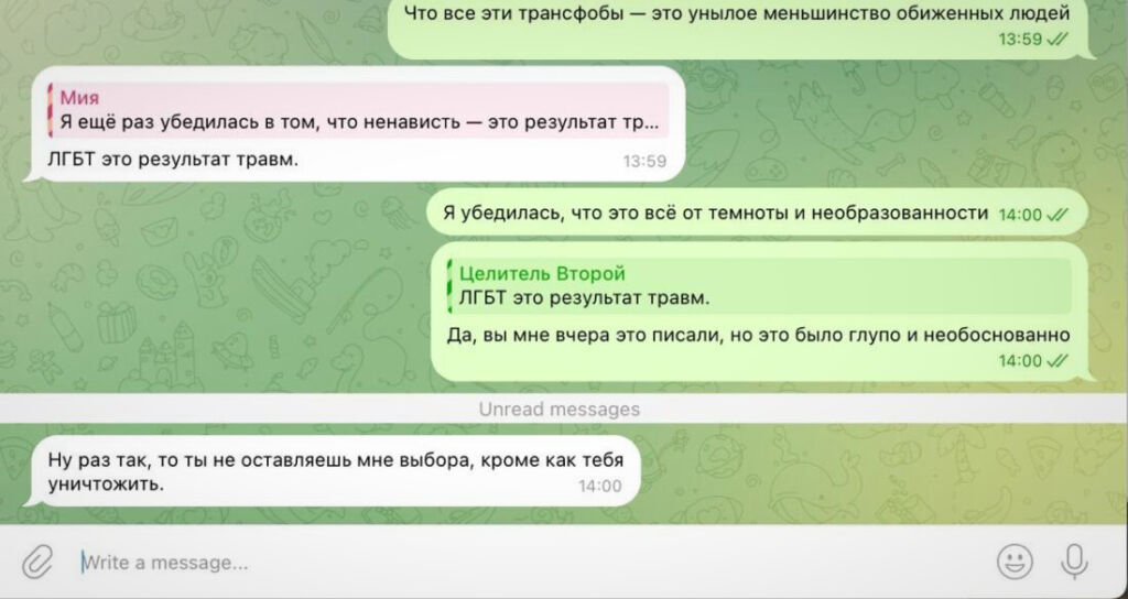 В арсенале методов Целителя Второго — не только организация онлайн-травли ЛГБТ*-активистов и накрутка ботов на их каналы, но и жалобы в госорганы европейских стран, где живут его «цели». Например, он попробовал навредить живущей в Нидерландах трансдевушке Мие Григорьевой. Сперва убеждал ее в том, что «ЛГБТ* — это результат травмы», потом пытался увести у нее телеграм-аккаунт, а затем угрожал «отобрать детей» и ради этого написал заявление в полицию.